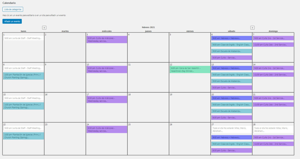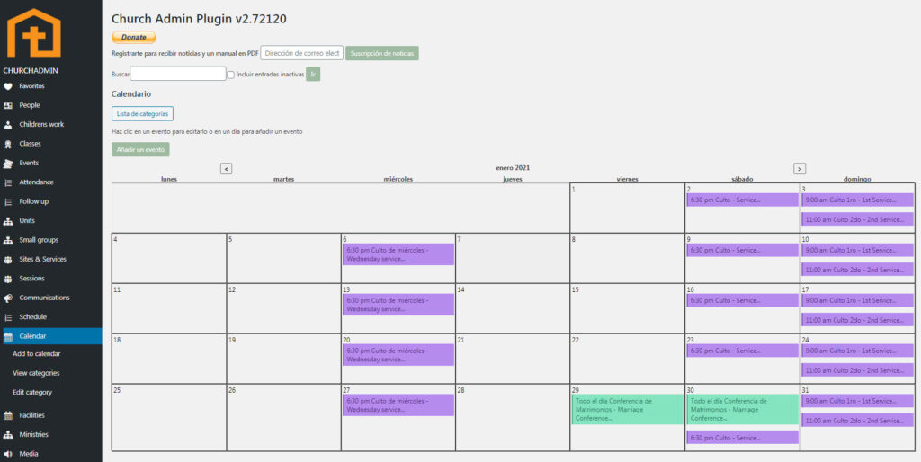 El calendario es una característica muy importante de la administración de Church Admin. Es muy fácil de usar y actualizar. Cuando hayas configurado todos sus sitios y servicios, eventos, clases, etc. el calendario mostrará todo automáticamente en formato mensual, y puedes agregar eventos del calendario directamente desde la página Calendario.