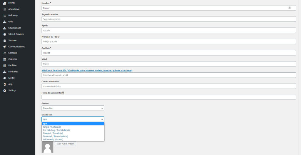 Desplaza poquito para abajo hasta llegar a Estado civil y haz clic en el campo para cambiarlo. Elige el estado civil deseado desde el menú desplegable.