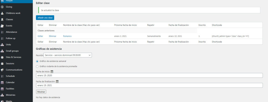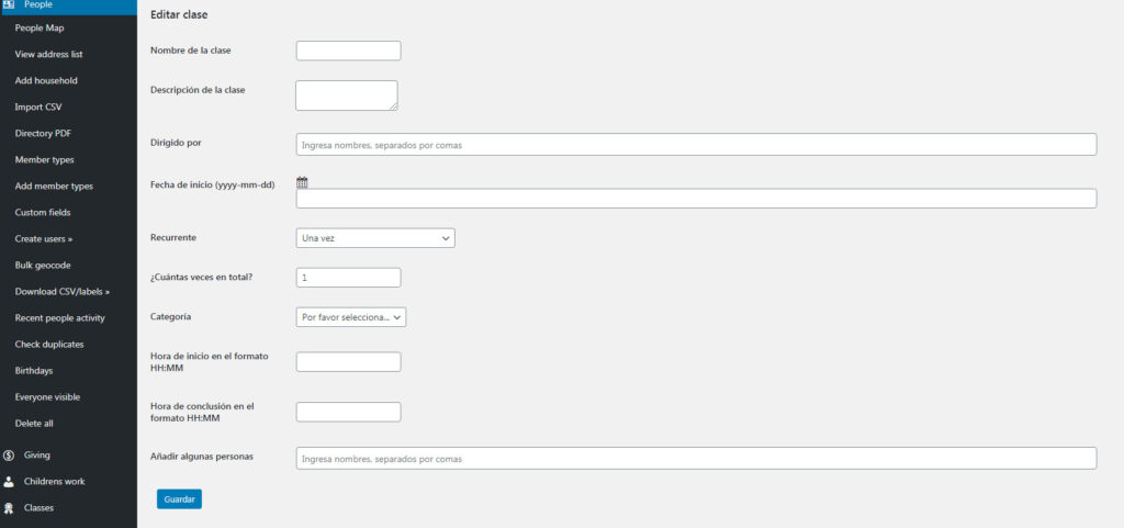 SI tu iglesia ofrece clases bíblicas, aparte de servicios y grupos pequeño, puedes ingresarlos como clases. De esta manera, puedes permitir que los miembros de tu iglesia vean las clases disponibles en tu iglesia y se registren en línea.