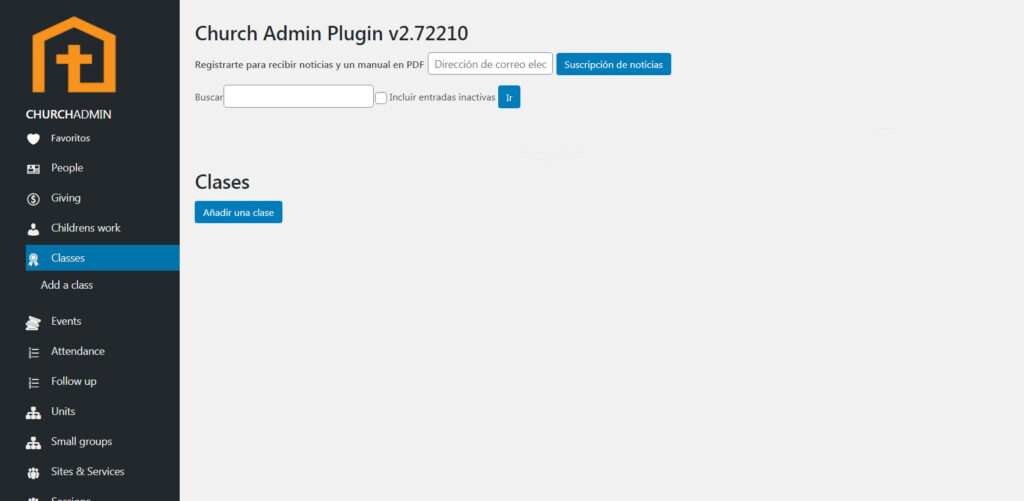 Para crear una clase, haz clic en Añadir una clase en la página Clases, o haz clic en Añadir una clase en el sub-menú Clases en el menú de Church Admin.