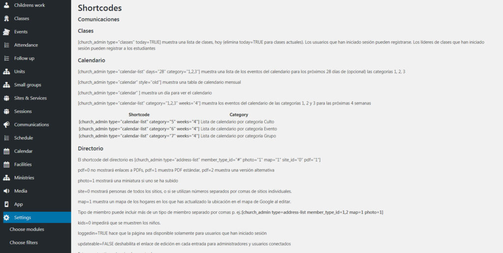 Otros shortcodes se pueden encontrar en los varios módulos de Church Admin como Clases, Sermones y Eventos.