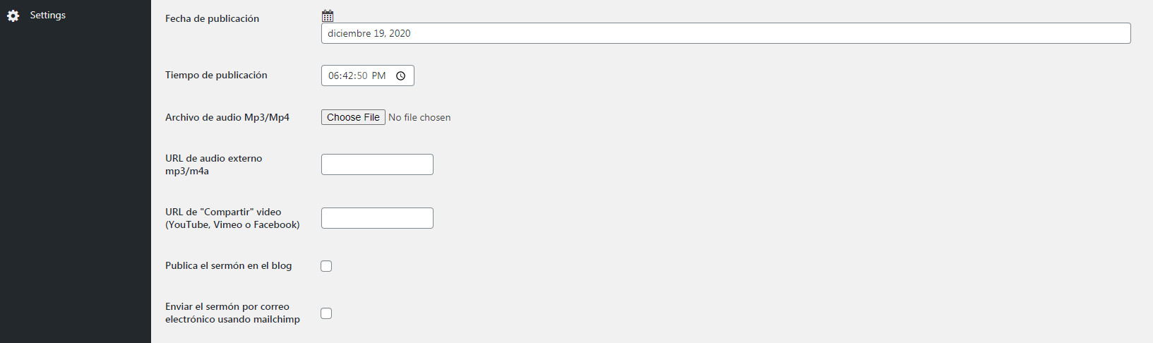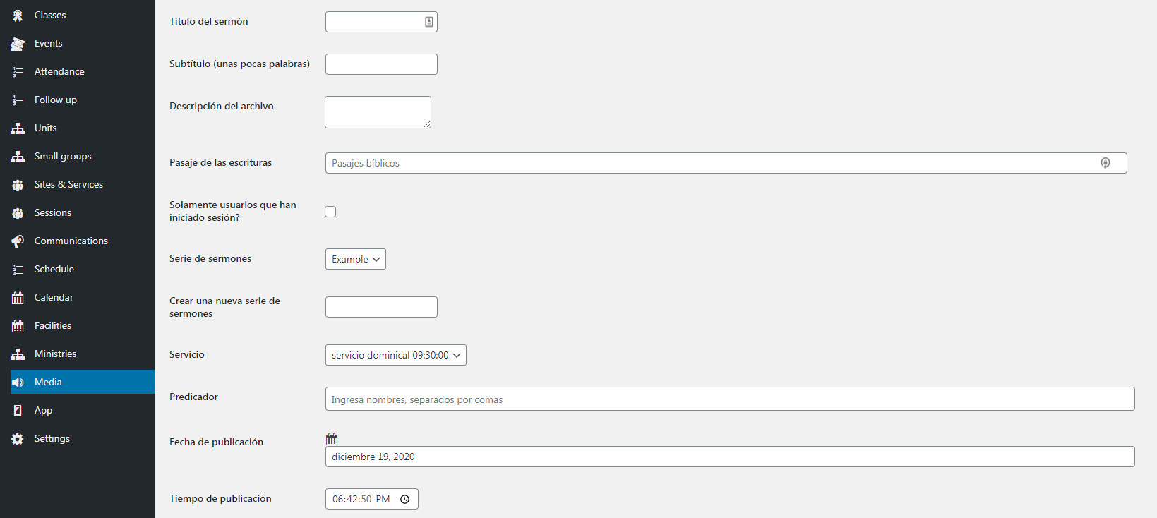 Hora de publicación: aunque es bastante irrelevante si has seleccionado un servicio, aquí puedes especificar la hora en que se grabó el sermón.