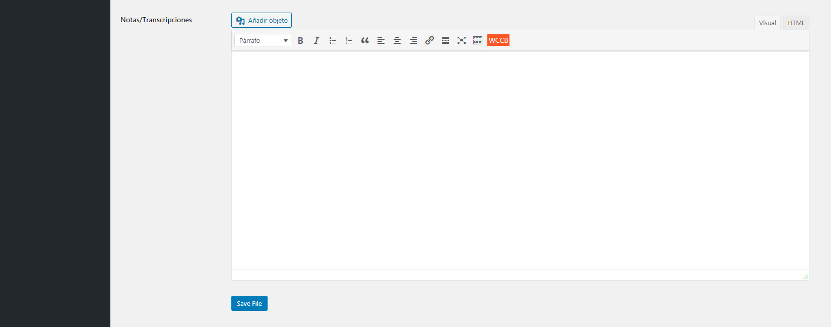 Notas/Transcripción: aquí puedes añadir notas sobre el sermón o una transcripción del sermón. En la esquina superior hay dos pestañas: Visual y Texto. Selecciona Visual para escribir normalmente. Selecciona Texto para escribir las notas/transcripción usando HTML o CSS.