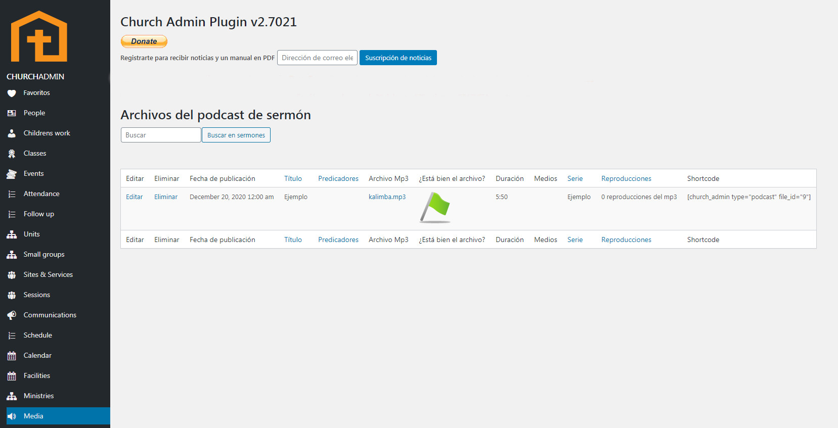 Una vez que haz guardado un sermón, aparecerá en la página de Medios. Puedes ver fácilmente si el archivo se cargó correctamente, cuántas veces se ha reproducido y más. Edita o elimina sermones desde aquí también. En el extremo izquierdo está el shortcode de cada sermón individual. Si copias el shortcode y lo pegas en una página, el sermón se mostrará junto con las notas/transcripción y cualquier archivo de audio o video que has cargado.