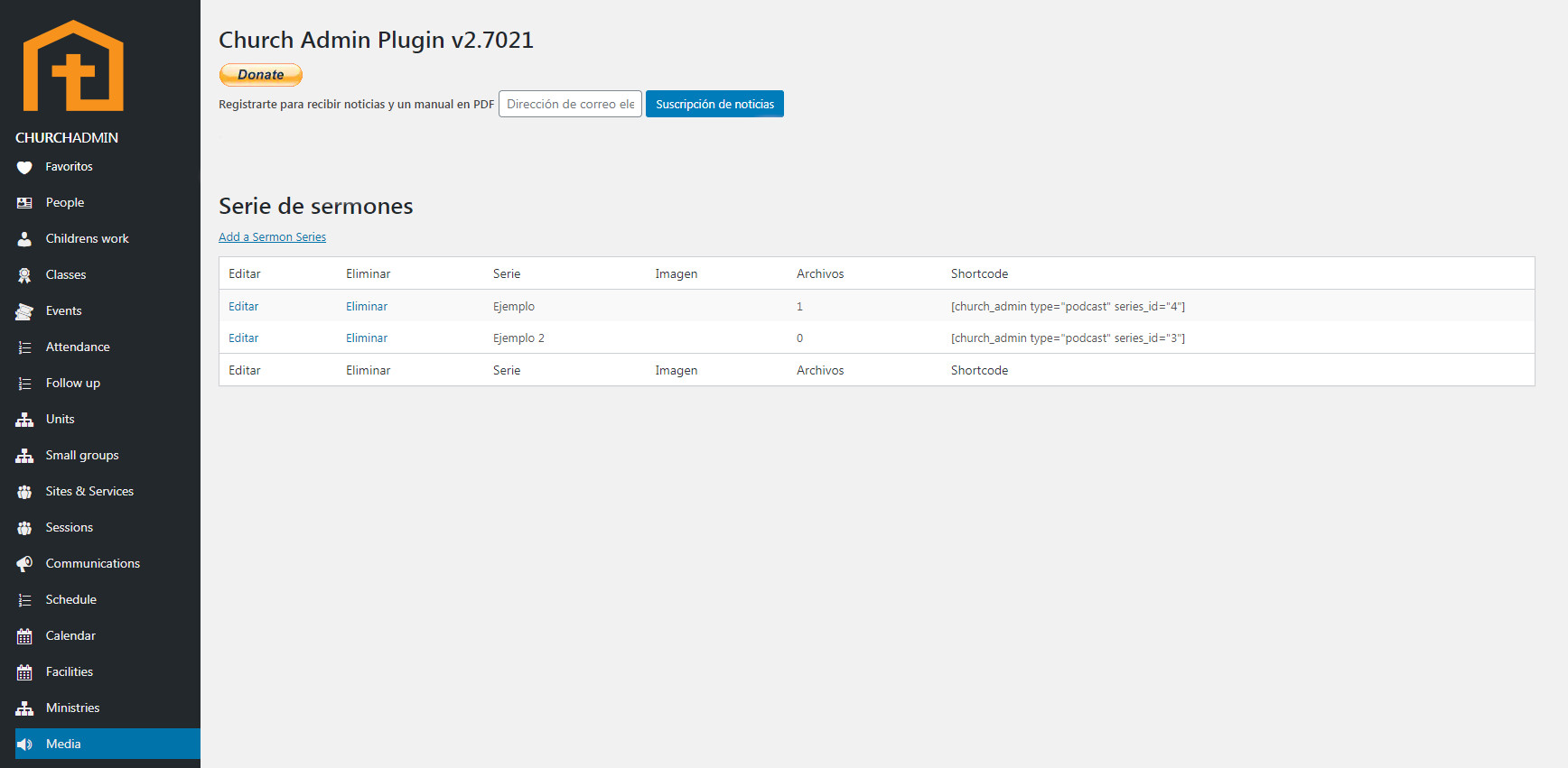Para añadir, editar o eliminar una serie de sermones, ve a Series de sermones en Medios en el menú de Church Admin.