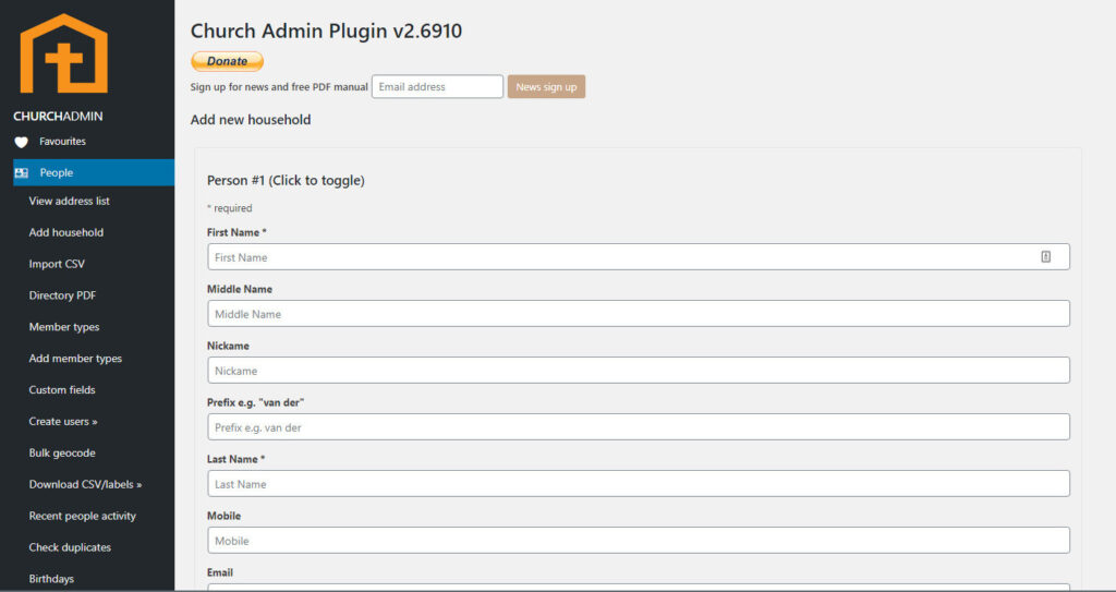 In the WordPress administration menu, click on the menu item Church Admin. Then, in the Church Admin menu, click on People. In the peole sub-menu click on Add household.